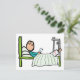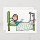 O design da cama de hospital mostra um boneco de palito lendo um cartão enquanto está deitado na cama. Tem uma perna quebrada em um gesso assinado levantada por equipamento especial. O paciente tem travesseiros confortáveis e uma atitude resignada relaxada em relação à estadia no hospital. Melhoras!