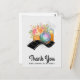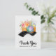 Um cartão postal de agradecimento com uma ilustração de aquarela de uma câmera laranja com um buquê de flores e uma tira de filme ondulada em preto e branco.