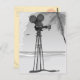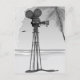 Câmera de filme antiga de época em uma praia arenosa, impressão de ilustração em preto e branco.