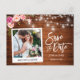 Estilo Moderno de Pincel, Estilo de Câmera Instantânea, Foto do Casal Save The Date Anúncio de Noivado Cartão Postal - Madeira Rústica Country, Luzes de Corda em Pote de Pedra. Inclui Floral Rosa com rosas e folhagens botânicas.