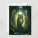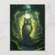Uma silhueta de uma coruja está sobre um caminho em uma exuberante floresta mossita, banhada à luz eetérea.
