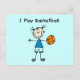 Uma figura de palito de menina jogadora de basquete com camiseta azul e texto que diz "Eu Jogo Basquete" em camisetas de basquete feminino, moletons, canecas, cartões, adesivos, botões de basquete, chaveiros e mais!