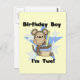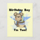 Camisetas segundos aniversários, fatos-chave, cartas, autocolantes, ímanes, bolsas e mais com um macaco-menino bonitinho com um cupcake azul e texto que diz "Garoto de Aniversário Eu Sou Dois!".