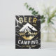 Uma ilustração gráfica de design sobre um fundo de mármore preto com uma paisagem de montanha, tenda, lua e estrelas numa estrutura de diamante de ouro que lê Cerveja e Camping Go Together.