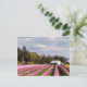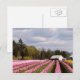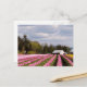 Campo de tulipas cor-de-rosa com edifícios fazendas, árvores, e os sopés que caem de trás no Vale do Skagit fazem uma bela e única peça floral de arte fotográfica.
