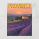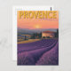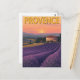 Este belo cartão apresenta uma ilustração em estilo vintage dos campos de lavanda ondulantes da Provença, França, ao pôr do sol. O design captura uma cena clássica de um edifício tradicional de pedra aninhado entre as fileiras roxas vibrantes, com ciprestes e colinas ao fundo. A luz quente da hora dourada e a tipografia retrô lhe dão a sensação de um pôster de viagem atemporal. É o cartão perfeito para uma nota das suas viagens ou um presente para um amante da natureza e da arte.