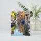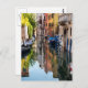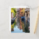 Um canal colorido em Veneza, Itália. Os azuis, verdes, laranjas e amarelos dos barcos, edifícios e plantas circundantes refletem-se na água do canal. Este cartão postal é totalmente personalizável.