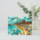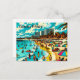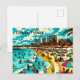 Mantenha contato com essa arte em estilo de história em quadrinhos pop art com vibrações vintage, Se você está visitando ou morando em Cancun, México, então envie um oi para seus amigos e familiares a bordo! A arte retrata pessoas se divertindo na costa da praia com hotéis e prédios de apartamentos ao fundo, belas palmeiras, guarda-sóis coloridos e um céu nublado azul magnífico.