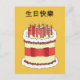 Um grande bolo de aniversário de cor pastel, com várias velas acesas no topo, sobre um fundo de cor ouro. A imagem tem "Feliz Aniversário" em Cantonês escrito acima do bolo.