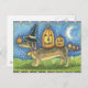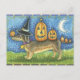Design gráfico de um filhote de solha vestindo um chapéu pontiagudo e com 2 abóboras entaladas nas costas. e abóboras na cauda e no nariz. Muito colorido.