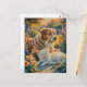 Este design apresenta uma cena serena de um cão castanho-dourado e um gato branco descansando juntos em um jardim vibrante. A luz solar quente filtra-se através da folhagem, lançando sombras salpicadas no caminho de pedra. Ao seu redor, há flores exuberantes em tons de laranja, amarelo e roxo, criando uma atmosfera de coexistência pacífica.