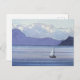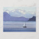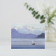 Uma pintura aquosa pacífica de um veleiro que percorre águas calmas em tons legal, azuis e violetas.