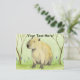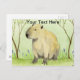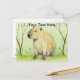A watercolor painting of a Capybara sitting amongst blue flowers in the spring adorns this customizable Postcard!