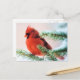 Um cardeal macho vibrantemente vermelho senta-se assoprado ao frio em um galho de abeto deliciosamente atordoado pela neve. Ideal para qualquer amante de pássaros ou da natureza para o feriado de inverno!