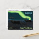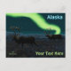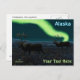 Duas renas-de-coleira (Rangifer tarandus), também conhecida como rena, caminham a tundra à noite enquanto migram para sul durante o inverno. A geada está no chão e as luzes do Norte brilham acima de montanhas distantes. Texto lendo "Alaska" aparece em azul e branco brilhantes Adicionar seu próprio texto.