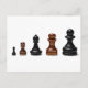 Uma linha de cinco peões de xadrez de tamanhos diferentes, do menor à esquerda para o maior à direita, como símbolo do crescimento da carreira empresarial. Isolado sobre o fundo branco.