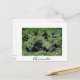 Cartão postal de um grupo de gorilas selvagens de montanha, com o silverback e bebês a resfriar na selva verde do parque nacional dos vulcões em Ruanda, na fronteira com o Congo e o Uganda, com uma fronteira branca e o texto: "Ruanda".