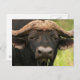 Búfalo-d'água com chifres curvos, mastigando algumas ervas.