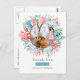 Cartão-postal de convite de casamento de verão na praia com tons de coral e turquesa, projetado para ser personalizado rápida e facilmente com os detalhes do seu evento.