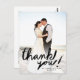 Personalize esta Na moda Photo Obrigado Postcard, projetada com o script de manuscrito moderno de na moda bold texto negro Obrigado! sobre uma fotografia vertical. Substitua a imagem modelo por sua própria imagem, para obter melhores resultados, use a imagem de alta resolução. Esta design tem um texto: "Obrigado por partilhar no nosso dia especial." Você pode alterar as palavras com suas próprias palavras ou excluir o texto para mantê-lo vazio. *créditos de fotos Modelo © por Sean McGrath