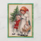 Compartilhe alegria de férias com este cartão postal de natais vintages com duas crianças vestidas de roupas de inverno antiquadas. Um carregar uma cesta de presentes enrolados, enquanto o outro segura uma pequena árvore de Natal. Colocada contra um fundo bege quente com uma clássica fronteira verde e dourada, esta design de eterno traz de volta a magia das celebrações tradicionais de Natal.