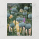 Cartão postal com fotografia de cabeças de papoila azul/verde com rosas amarelas em segundo plano.