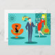 Querida, estou em casa! Este Cartão-postal de Casal de Cartoon da Idade do Espaço Retroativo terá inveja do casal de cartoon em um cartão de saudação! O design apresenta um fundo turquesa com tijolos lacrimogêneos e uma lareira de cone verde-oliva. Um gato preto e elegante está sentado numa cadeira laranja elegante. Há um relógio de parede lacrimogêneo e uma lâmpada pendente de dois níveis em tons de amarelo, azul e preto. Na frente e no centro, há um distinto empresário martini a nadar num terno azul e gravata laranja. Ao seu lado, a sua loira bomba de uma esposa troféu está a vestir um vestido vermelho de bruxa e a segurar uma bandeja de martinis. Va-va-va-voom!