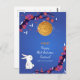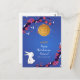 Bonito fundo azul com lua de lua e um coelho é o cartão perfeito para se enviar para desejar às pessoas um Feliz Festival de outono de Médio. Adicione seu nome de família ou remova-o se preferir. dentro de vazio para sua saudação pessoal.