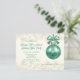 Cartão postal do convite de festas de fim de ano com texto modelo. Cor verde e dourada com um grande ornamento verde-lacrimejante na frente e flocos de neve na frente e atrás. Adicione todas as informações da parte à frente e ao endereço usando as linhas na ordem inversa.