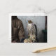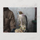 Cartão-postal de um falcão vendado usado para falcoaria na mão de um falcoeiro em Doha, a capital do país do Golfo Catar.
