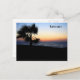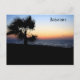 Este cartão postal bonito mostra uma fotografia de uma palmeira perto do oceano no pôr do sol. O texto no canto superior direito é personalizável para se adequar ao lugar tropical que você quiser!