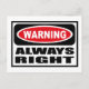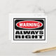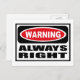 Aviso SEMPRE CERTO Cartão postal que você pode personalizar em www.WarningSignShirts.com e apresenta um sinal de aviso vermelho e preto e SEMPRE CERTO em letras negrito para avisar o mundo. Você também pode personalizar seu próprio sinal de aviso Cartão postal com o texto desejado.