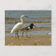 Cartão-postal com um Snowy Egret (Egretta thula) e um Oystercatcher americano (Haematopus palliatus) a caminhar na areia à beira da costa.