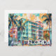 Um cartão-postal da Flórida retrógrada, capturando a essência da Praia do Sul de Miami, com seus prédios de arte retrógrados ao sol, e balançando palmeiras. Este cartão postal abstrato artístico da Flórida faz parte de uma série de cartões postais criados num estilo de arte poste-impressionismo e é inspirado por diferentes locais em todo o mundo.