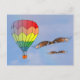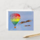 Balão de Ar Quente e dois pássaros voam em um céu azul com nuvens apagadas. O balão tem listras arco-íris de vermelho, laranja, amarelo, verde e azul. Os pássaros têm asas marrons. A parte de trás do cartão tem o título "Venha Voar Comigo".