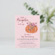 Uma abóbora de aquarela bonito com florais coloridos de outono e um fundo cor-de-rosa macio completam este doce Convite para Chás de fraldas de Abóbora Pequena. Personalize todas as informações do seu chá de fraldas com conveniência. Envie este cartão postal de convite para chás de fraldas para economizar custos e comodidade. Perfeito para um chá de fraldas de outono para uma garota.