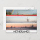 Cartão postal com uma colagem de três fotos panorâmicas com moinhos de vento nos Países Baixos e o texto: "Países Baixos". Um mostra um moinho de vento com tulipas e um arco-íris, um apresenta um moinho de vento na neve no inverno e outro mostra moinhos de vento em Kinderdijk com alguém patinando no Sunrise.