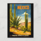 Ótima imagem de um cartaz de viagem vintage para o México com um cacto em primeiro plano e casas de hacienda e flores ao fundo.