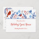 Pássaros vermelhos e azuis festivos e botânicos fazem fronteira com o cartão postal Holiday Open House. Design bonitinho e alegre com aves estilizadas, folhas e cones de pinho. Perfeito para qualquer feriado casual/Natal juntos. Personalize com suas próprias informações.