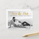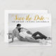 Casamento com guião de ouro moderno Salve o cartão postal com foto de Data. Esta tipografia contemporânea Save the Date design apresenta uma foto em preto-e-branco do casal e o texto "Save the Date" (Salvar a data) em uma fonte moderna de script.