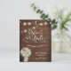 Country Save the Date Wedding - Madeira de celeiro russo com luzes brilhantes de cordas no topo e um jarro de pedreiro com fôlego de bebê e flores de camomila pintadas à mão originais (ou margarida branca). Belo texto caligráfico para Salvar a Data - Design por BarefootBride™
