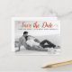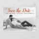 Casamento com script moderno de ferrugem Salve o cartão postal da foto de Data. Esta tipografia contemporânea Save the Date design apresenta uma foto em preto-e-branco do casal e o texto "Save the Date" (Salvar a data) em uma fonte moderna de script.