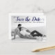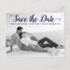 Casamento com script azul do marinho moderno Salve o cartão postal da foto de Data. Esta tipografia contemporânea Save the Date design apresenta uma foto em preto-e-branco do casal e o texto "Save the Date" em azul em uma fonte moderna de script.