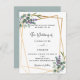 Um fundo branco na moda na frente. Decorado com eucalipto e lavandas florais. Um quadro geométrico dourado. Personalize e adicione seus nomes e detalhes. Fundo: fundo colorido de cinza verde. Dica: Se você não quiser que pareça um cartão postal, clique em personalizar, vá para o verso e remova o divisor e o carimbo de posto.