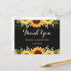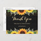 Esta design rustica apresenta luzes de cordas brancas de ouro pálido e rendas junto com girassóis amarelos e ramos de flores brancas contra um fundo de cinza de carvão preto ou escuro. O texto personalizável aparece em branco-pálido-dourado na frente na escrita popular e na tipografia serif. O texto no verso é uma cinza escura correspondente em preto. Você pode personalizar esta obrigado que você faz do seu casamento mudando o texto na modelo.