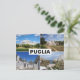 Cartão postal com uma colagem de quatro fotos das famosas casas de trilho, cidade de Alberobello, Ostuni, cidade de White e praia em Polignano a Mare, na Apúlia, Itália, e o texto: "Apúlia".