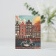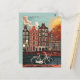 Uma ilustração de Amsterdã, a capital dos Países Baixos, apresenta casas charmosas e coloridas ao longo de um canal, uma bicicleta branca no primeiro plano e árvores de outono sob um céu azul com pássaros voando.