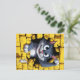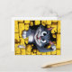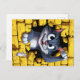 A dynamic and playful illustration depicting a gray-and-white tabby cat with large, wide eyes emerging from a hole in a bright yellow wall. The cat holds up a paw, from the end of which dangles a small white mouse suspended by a thin thread or tail. The scene has a humorous, fairytale feel, emphasized by the cat's expressive facial expression and the vibrant colors of the brick wall. The contrast between the dark interior of the hole and the light wall adds depth to the image and draws the eye to the central figures.