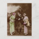 No início dos anos 1900, cartões fotográficos reais estavam na moda. Cavalos eram frequentemente usados em fotos encenadas para retratar romance e luxo. Aqui temos um cavalheiro vestido formalmente com duas senhoras bem vestidas e um cavalo baio. Isso foi digitalizado a partir de um cartão postal vintage autêntico com tintura manual e, em seguida, retocado e aprimorado para trazê-lo de volta à sua antiga glória.