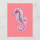 Um cavalo marinho estilizado com matizes rosas e roxas vibrantes se destaca contra um fundo escuro. Ele apresenta um intrincado design com escalas padronizadas e uma cauda enrolada que sugere uma interpretação caprichosa e artística.